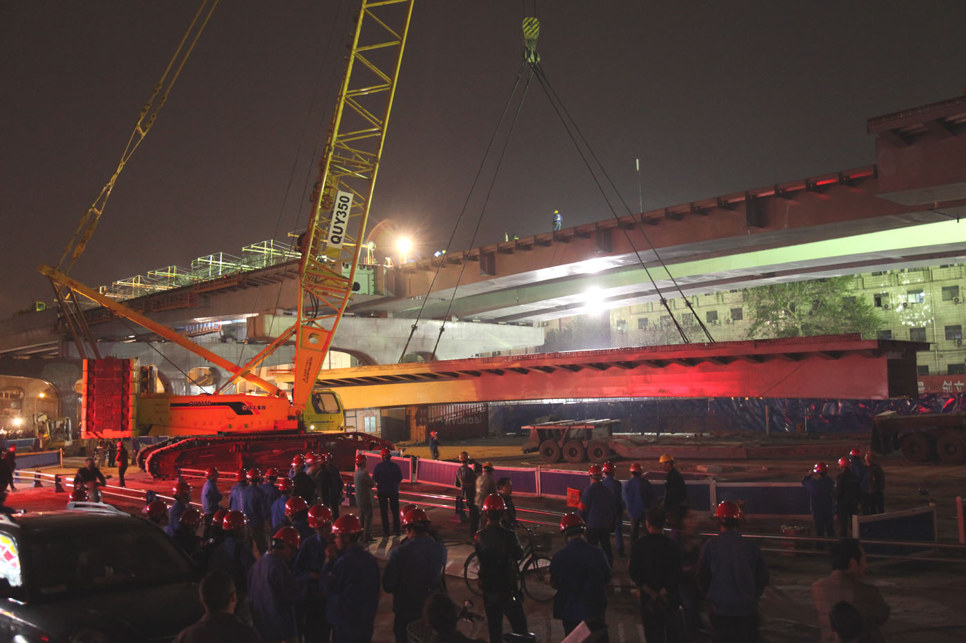 成溫路改造工程東起于二環(huán)路成溫立交橋,西止于三環(huán)路蘇坡立交橋東側(cè),全長2.5公里。建成后的成溫路車速將由現(xiàn)有的20公里/小時提高到60公里/小時,實現(xiàn)城西方向的快速出城,其中的快速公交系統(tǒng)將與地鐵四號、七號線無縫對接,形成城西立體交通網(wǎng)。項目自2012年11月23日首吊小箱梁以來,經(jīng)過項目部全體員工123天全力以赴地辛勤勞動,順利完成了全部650片小箱梁及16000㎡鋼箱梁的吊裝,提前5天實現(xiàn)業(yè)主要求的節(jié)點目標(biāo)。