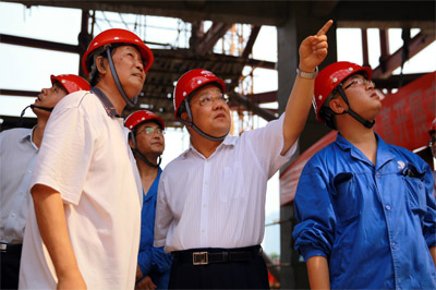 下午三時許,室外溫度超過35°,在成都大魔方項目部,程并強(qiáng)一行和項目部一線員工親切交談,感謝他們冒著高溫不辭辛苦地工作。在觀看大魔方項目動畫演示介紹后,程并強(qiáng)來到演藝中心施工現(xiàn)場,仔細(xì)了解工程進(jìn)度情況和存在的難點問題,他要求項目部嚴(yán)格按照公司管理做好工作,相互協(xié)調(diào)溝通,做好總包的經(jīng)驗總結(jié)。