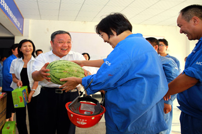 ???????????????????? ?程并強(qiáng)在元華路為一線員工送上西瓜