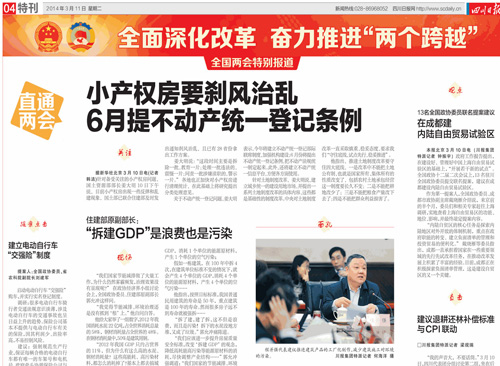 3月11日《四川日?qǐng)?bào)》頭版、04版和12日《四川日?qǐng)?bào)》05版兩會(huì)特刊,刊發(fā)了全國(guó)人大代表、中國(guó)五冶集團(tuán)董事長(zhǎng)、黨委書記程并強(qiáng)接受采訪的新聞。