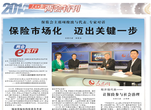 3月11日,《人民日報》特別開辟的兩會報道全媒體訪談欄目——“兩會e客廳”刊播。本期節(jié)目以“用改革提升保險業(yè)服務能力”為主題,邀請了中國保監(jiān)會主席項俊波,全國人大代表、中國五冶集團董事長、黨委書記程并強,北京大學風險管理與保險學系主任鄭偉等三位嘉賓,共話保險業(yè)改革,交流觀點和看法。