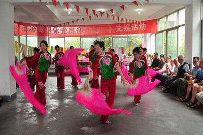 6月27日上午9點(diǎn),從雙林路離退休活動(dòng)室中傳來一陣陣悠揚(yáng)的歌聲,一群身著大紅喜慶服飾的美女正翩翩起舞,手上揮舞著的粉扇上下擺動(dòng),婀娜的身姿劃出一道道美妙的漣漪。這是中國五冶集團(tuán)離退休黨員迎“七一”活動(dòng)現(xiàn)場(chǎng),而表演者們,正是這樣的一群?“資深”美女。