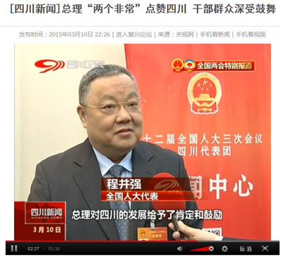 為此,四川衛(wèi)視在3月10日《四川新聞》“全國兩會特別報道”中,以“總理‘兩個非常’點贊四川?干部群眾深受鼓舞”為主題,對參加十二屆全國人大三次會議四川代表團部分全國人大代表進行了采訪,全國人大代表,中國五冶集團董事長、黨委書記程并強在采訪中表示:總理對四川的發(fā)展給予了肯定和鼓勵,同時也指明了一些方向,特別是通過加大基礎設施建設、水利建設、交通建設,促進四川發(fā)展,要求四川轉型升級方面感觸很深。”