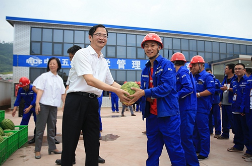 ? ? 同時,集團(tuán)公司領(lǐng)導(dǎo)一行對公司宜賓片區(qū)在建項目員工致以親切慰問,為大家送上了西瓜、飲料、霍香正氣水等防暑用品,并叮囑大家在高溫施工期間,要保重身體、確保安全,讓公司放心,讓家人放心。(鄧超)