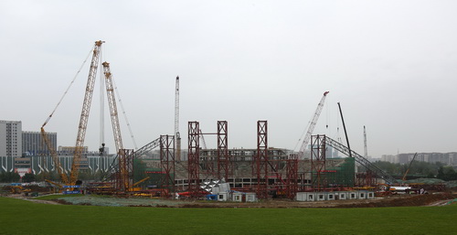 在主舞臺的施工現(xiàn)場,兩臺大吊車吊起一根鋼筋龍骨,在空中緩慢移動,而在地面的基座上,幾名焊工正在緊張焊接粗壯的支撐架?!斑@是我們吊裝的第二根主拱構(gòu)件,第一根已經(jīng)在昨天成功吊裝并脫鉤。”成都露天音樂公園項(xiàng)目經(jīng)理呂興建告訴記者團(tuán),近段時間,主拱的吊裝都將是最重要的任務(wù)。
